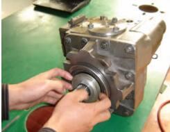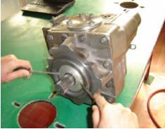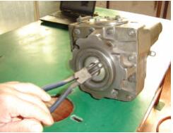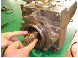 建議所有的軸端的密封件要更換, 如果需要繼續(xù)使用舊件, 注意在拆裝過程中保護(hù)各個元件不可損壞。 拆下液壓泵軸外面的大擋圈。從內(nèi)側(cè)的凹槽中取出擋圈。注意:操作時,一只手握住卡簧鉗,另一只手護(hù)住卡簧,防止彈出.