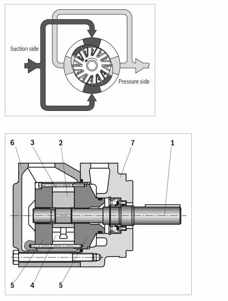 力士樂液壓泵PVV型是具有恒定排量的葉片泵。在定子環(huán)(3)中運行的轉子(2)位于驅動軸(1)的齒廓上。轉子的槽容納葉片(4),葉片(4)在轉子旋轉時通過離心力壓靠在定子環(huán)的內表面上。置換器腔室由控制板(5)橫向密封。由于定子環(huán)的雙偏心設計,在每種情況下存在兩個與兩個抽吸室相對的壓力室,其提供軸的液壓卸載。所以它只需要傳遞扭矩。葉片在通過抽吸范圍時部分卸載。這種卸載具有減少磨損的效果并確保高效率。只需卸下蓋子(6),泵插件(由轉子,葉片組成,定子環(huán)和控制板)可以在不需要從泵架上拆下殼體(7)的情況下拆下。這允許泵的快速維護和修理。