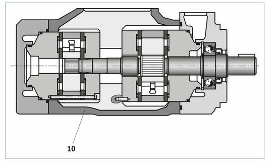 通過在一個關節(jié)軸上安裝兩個泵安裝套件來形成雙泵。進油口通過中央殼體(10)中的一個接頭吸入口實現。出油口由兩個泵安裝套件單獨實現。對于前泵安裝套件,壓力端口位于法蘭外殼中,用于蓋子中的后泵安裝套件。較大的泵安裝套件始終位于法蘭殼體側。相同框架尺寸的泵安裝套件不能用作雙泵。